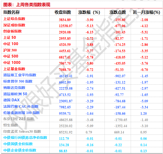 上周,歐美主要市場普遍下跌,其中,道指下跌1.91%,標普500下跌1.95%,納斯達克指數下跌2.74%;道瓊斯歐洲50 下跌1.93%。亞太主要市場漲跌不一,其中,恒生指數下跌5.09%,日經225指數下跌3.48%,印度孟買Sensex30指數上漲0.79%。