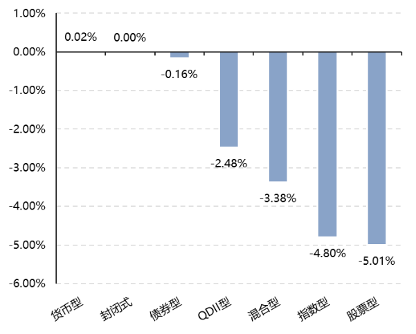上周,國內權益基金普遍下跌,其中股票型基金平均下跌4.94%,混合型和指數型基金平均分別下跌3.38%和4.52%。QDII基金平均下跌2.48%。