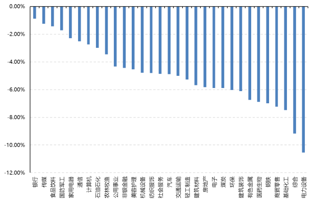 31個申萬一級行業中有無一個行業上漲。其中,銀行、傳媒、食品飲料表現居前,漲跌幅分別為-0.89%、-1.25%、-1.44%,基礎化工、綜合、電力設備表現居后,漲跌幅分別為-7.47%、-9.18%、-10.54%。